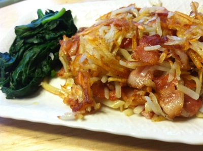 3. Heat a frying pan on high. The bacon itself gives off a lot of oil so you don’t need to place oil on the pan. Once the pan is heated, put the bacon on it and cook it on low to medium heat and cook until it changes color. Make sure that you don’t cook the bacon completely at this stage but only until it’s not raw anymore. Add the potato slices into the frying pan and using a wooden spatula, mix the slices so that it is covered in the bacon oil and the bacon is spread throughout. Once the potato starts becoming a bit translucent, stop mixing it and bring the heat up to medium high. This will help the potatoes to crisp and because of the starch in the potatoes, it should hold together a bit. Keep an eye out on it and when the potatoes seem browned on one side, flip it and do the same for the other side. It should take about 3 – 5 minutes each side, but it really depends on your stove top. Take a peek under it once in awhile if you’re afraid of it being too crispy. If you have a plate large enough, you can slide it off once both sides are done. I didn’t happen to have a plate large enough so I put it into a mound next to some spinach which I heated the same way I did for the quiche (step one). Bon appetit!