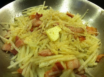 Sometimes I have a craving for comfort foods, soul food, ribs, chicken and waffles…and hash browns. I grew up with mom cooking this for us every once in awhile. I still remember when she made it for dinner and it was like having pancakes for dinner. A real treat! It was something I enjoyed having but we rarely had (once or twice a year). After baking the bacon and spinach quiche the other night, I had some bacon left. The next morning, I decided to use the remainder of the bacon we had to make my hubby his first bacon potato hash brown! My mom’s made this recipe either with the potatoes being on the softer side or crunchy. Since my husband enjoys crispy things (it’s yummy he says) and I enjoy not too crispy, so I made it in between. He says it’s a wonderful combination of bacon and potatoes. And it’s quite easy to make!